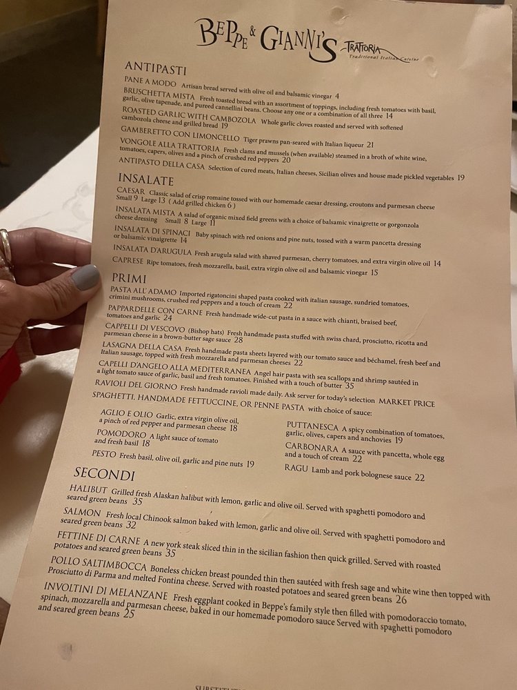 Beppe & Gianni’s Trattoria, located in Eugene, Oregon, offers a delightful Italian dining experience. With a menu boasting a variety of antipasti, insalate, and primi dishes, there is something for everyone to enjoy. The Antipasto Della Casa, Prosciutto e Melone, and Pasta All' Adamo are standout options that promise to satisfy your taste buds. Customers praise the friendly service and warm atmosphere, making it a popular spot for locals and visitors alike. Don't miss out on their delectable desserts, such as tiramisu and chocolate delights. While the restaurant can get busy, the wait is well worth it for the exceptional food and cozy ambiance. Overall, Beppe & Gianni’s Trattoria is a must-visit for Italian cuisine lovers seeking an authentic and memorable dining experience.